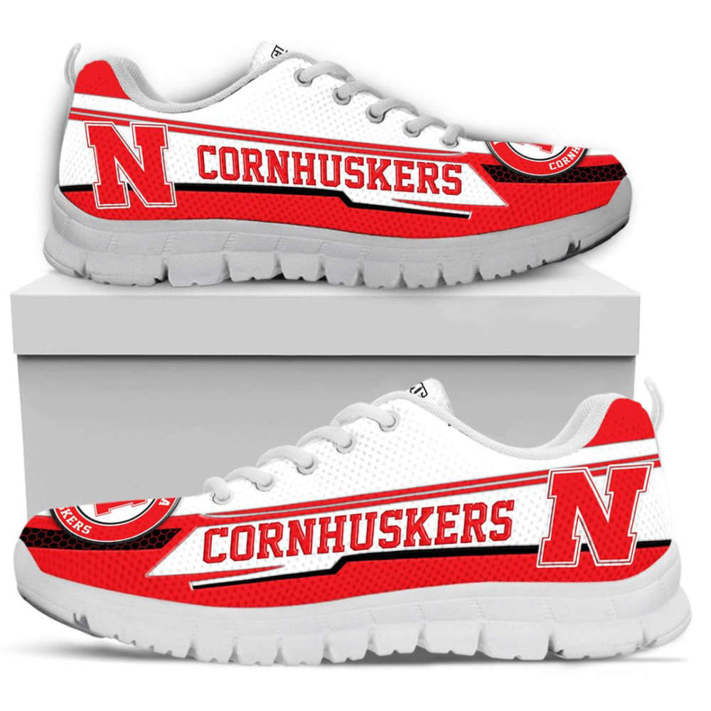These running shoes are crafted with meticulous attention to detail, featuring the iconic Nebraska Cornhuskers logo prominently displayed on the sides. The vibrant red and white color combination adds an extra touch of team spirit to your outfit, making you stand out from the crowd.