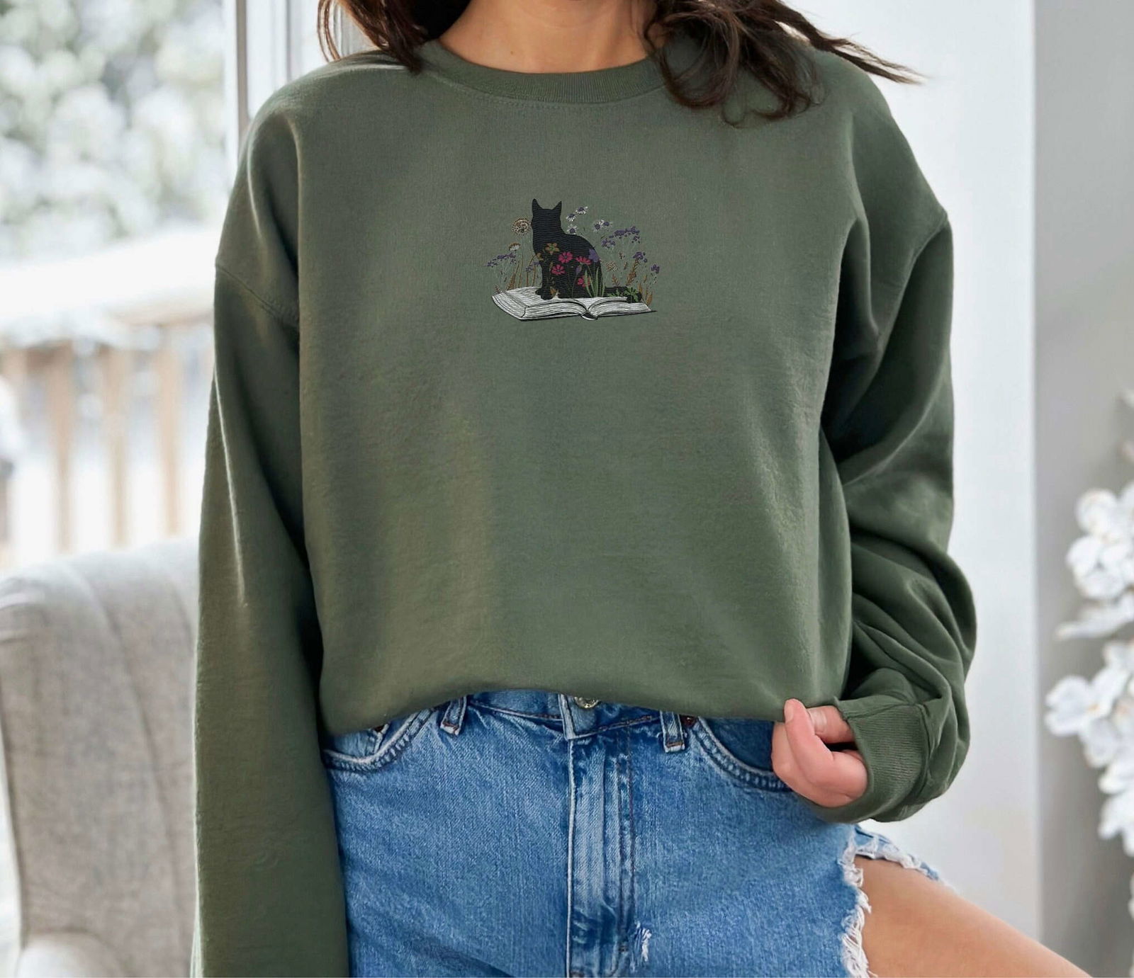 Experience the joy of wearing a unique piece of art that combines comfort, style, and a touch of whimsy. Order your Embroidered Cat With Book And Flowers Sweatshirt today and let your passion for cats and literature shine through!